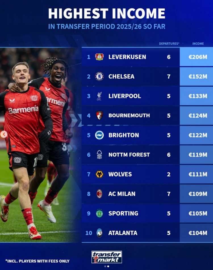 现在夏窗出售球员收入榜:勒沃库森居首,切尔西次席,赤军第三