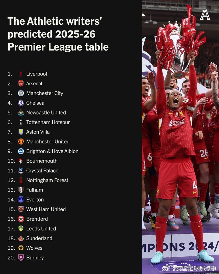 TA瞻望新赛季英超名次:利物浦夺冠,枪手曼城分列二三,曼联第8