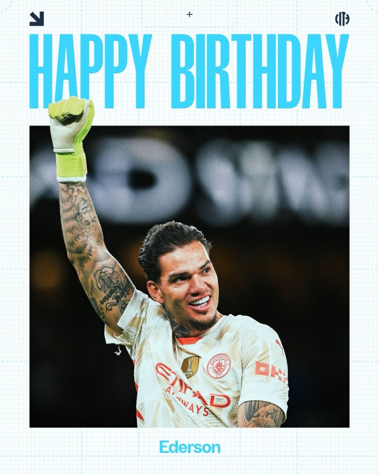 曼城官方社媒晒出埃德森的寿辰海报,配文:“祝你寿辰沸腾,埃德森!”