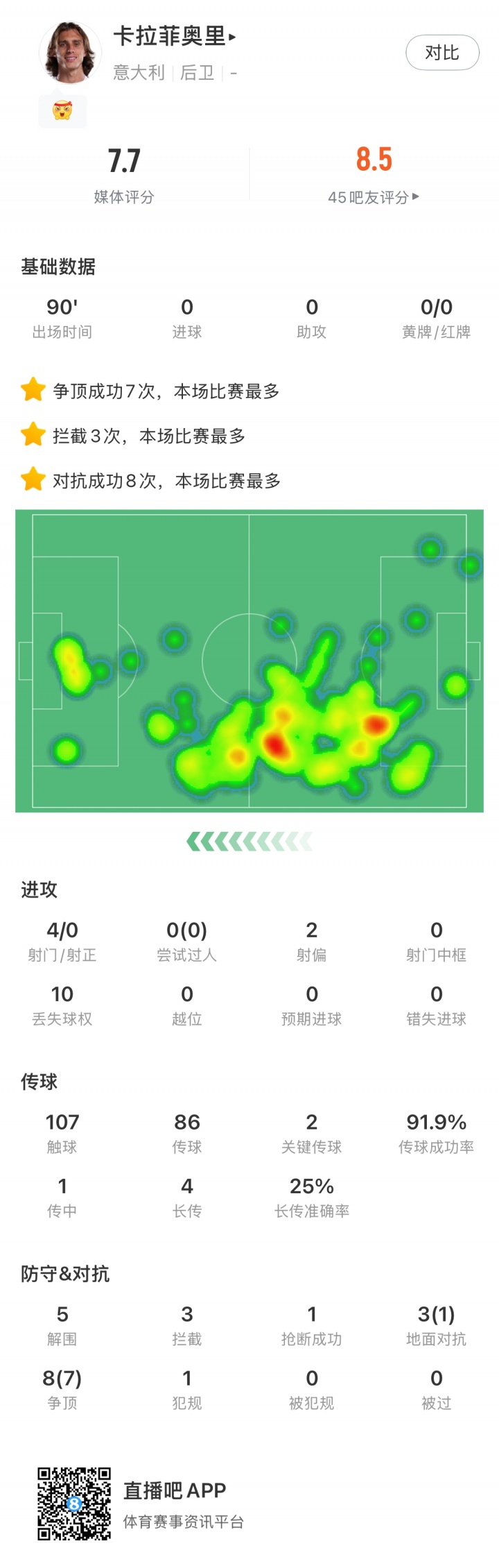 卡拉菲奥里提神大利踢左中卫,热区遍布前中后,叛逆正式传球兼顾