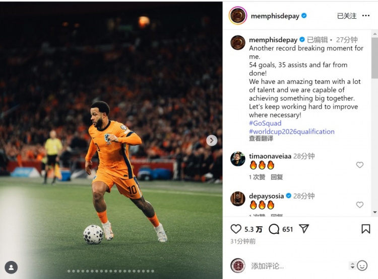 德佩社媒晒出比赛像片,并写谈:“对我来说又是一个谋害记载的时辰。 54个进球,35次助攻,何况远未结束!”