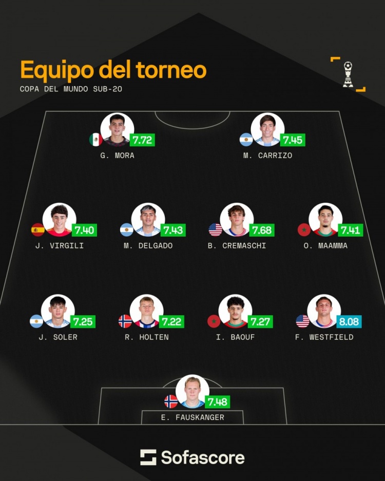 Sofascore世青赛最好阵:玛玛领衔摩洛哥2将入选,阿根廷3将在列