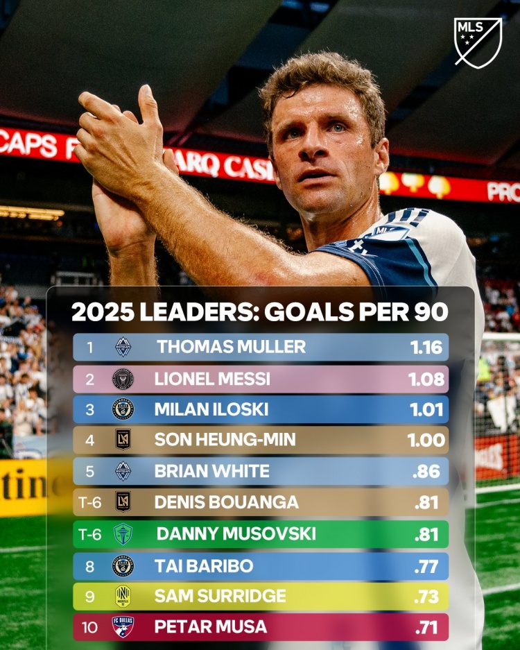 本赛季好意思职联每90分钟进球榜:穆勒1.16球居首,梅西1.08球次席