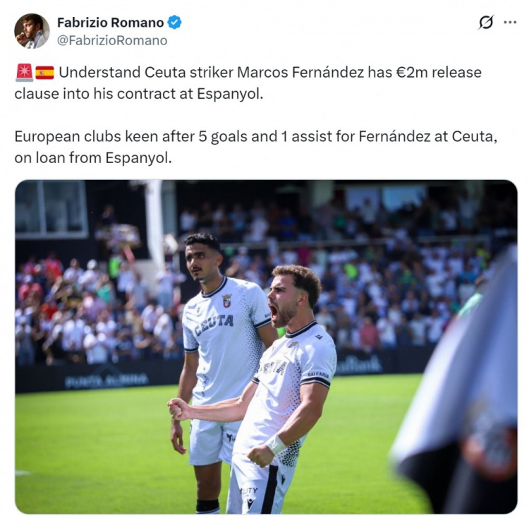 马科斯·费尔南德斯本赛季被西班经纪东谈主外租至休达,出战15场比赛5球1助。