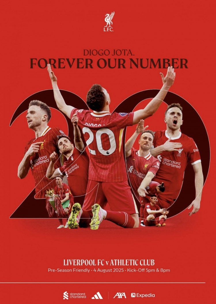 在2025-26赛季安菲尔德首场比赛日的特刊封面上,相配向若塔致意!他是恒久的利物浦20号球员。