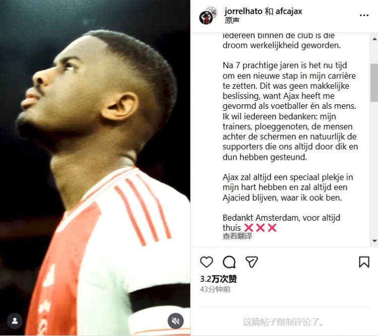经由7年的好意思好时光,咫尺是时期让我的行状活命迈出新的一步了。这是一个高深的决定,因为阿贾克斯不仅塑造了我成为如今这么又名球员,也塑造了我的东说念主格。我要感谢每一个东说念主,这包括了我的锤真金不怕火、队友、幕后使命主说念主员,诚然还有永久守旧咱们的球迷们。