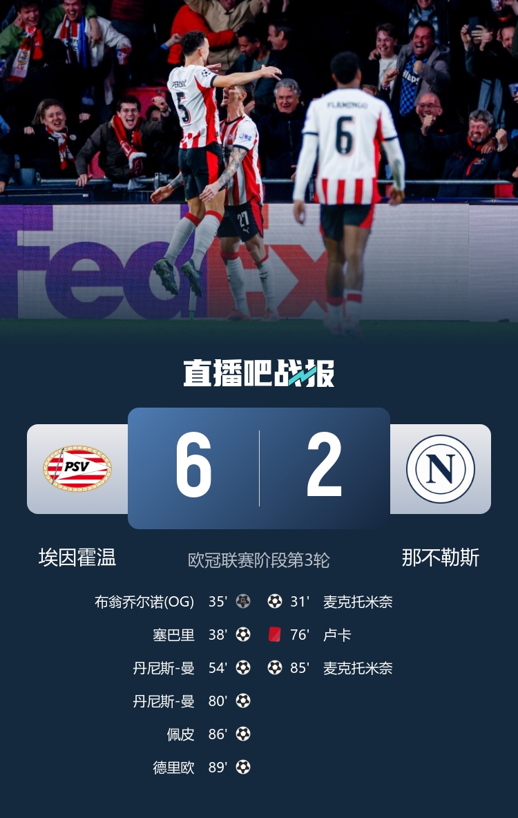 10月22日讯 欧冠联赛阶段第三轮比赛,那不勒斯客场2-6不敌埃因霍温。