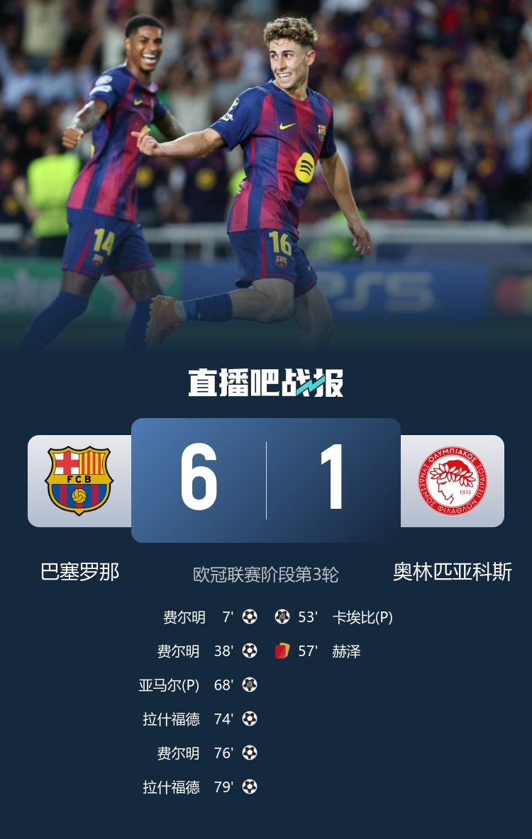 欧冠第3轮第一比赛日9场比赛一谈适度,这9场比赛一共轰进43球(场均4.8球),其中有三支球队单场轰出6+进球(巴萨6-1奥林匹亚科斯、巴黎7-2勒沃库森、埃因霍温6-2那不勒斯)。