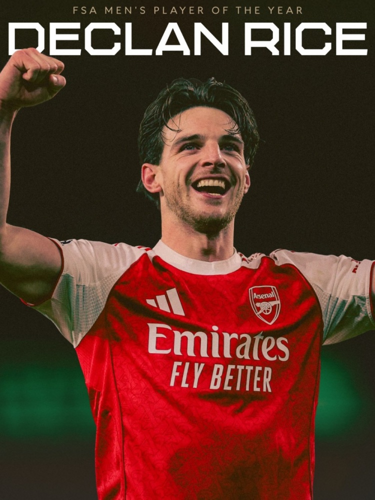 赖斯当选FSA年度最好球员,阿森纳社媒晒海报祝愿:实至名归