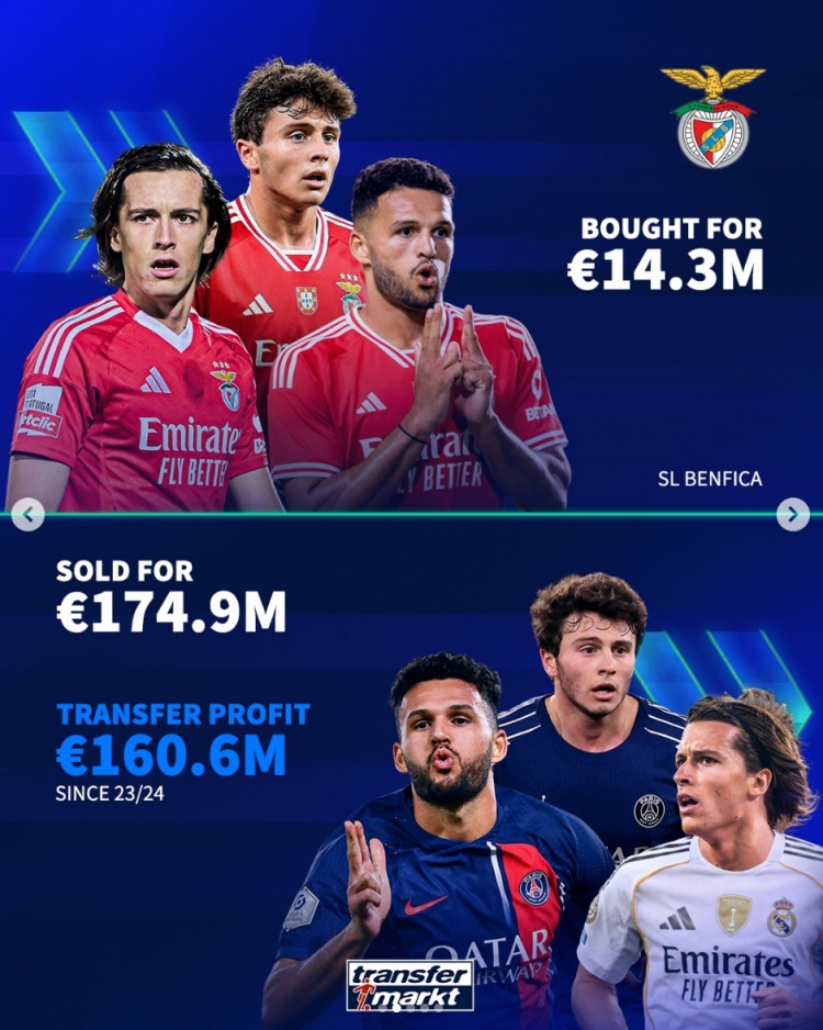 本菲卡:贡萨洛-拉莫斯(巴黎)、若奥-内维斯(巴黎)、A费(皇马),盈利1.606亿