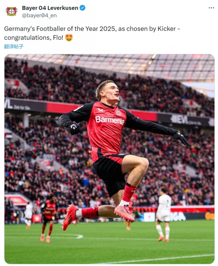 勒沃库森官方社媒晒出维尔茨效力球队时期的照片,并配文:“由《踢球者》评出的2025年德国足球先生,祝贺你,弗洛(维尔茨)!”
