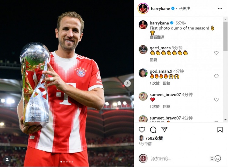 凯恩更新社媒动态,晒出手捧德超杯冠军奖杯的照片,配文:“本赛季第一波照片大放送!”
