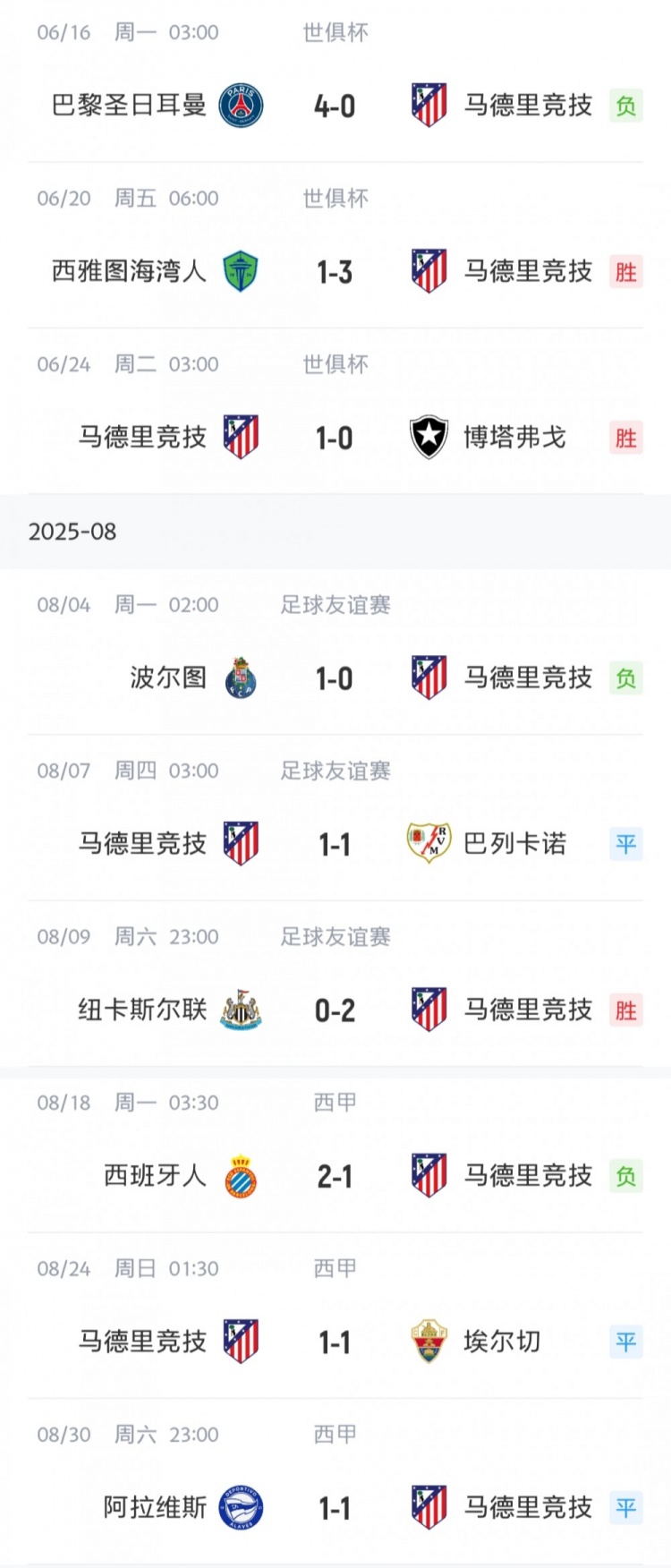 进攻问题大!马竞近6场正式比赛仅1场进球数>2,对手为西雅图