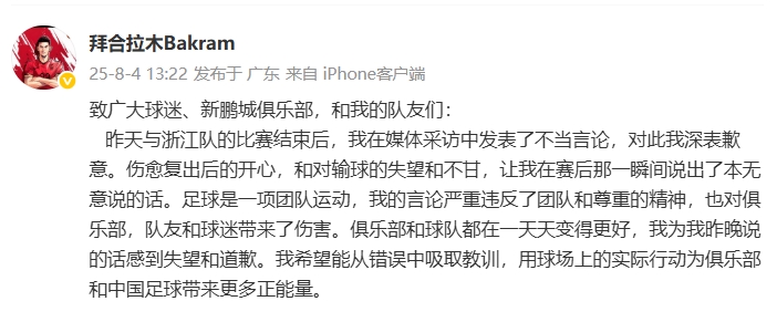 08月04日讯 针对昨日中超赛后对队友的批评言论,拜合拉木在社交媒体上发文致歉。致歉内容如下:
