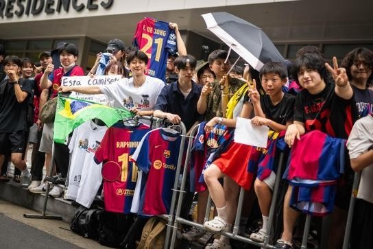 约百名球迷手持旗帜、球衣和标语在球队下榻酒店守候。从日本到韩国,巴萨始终受到当地拥趸的热情追捧,大邱也不例外。这场亚洲冒险的终章,将于今夜在大邱体育场书写完毕。