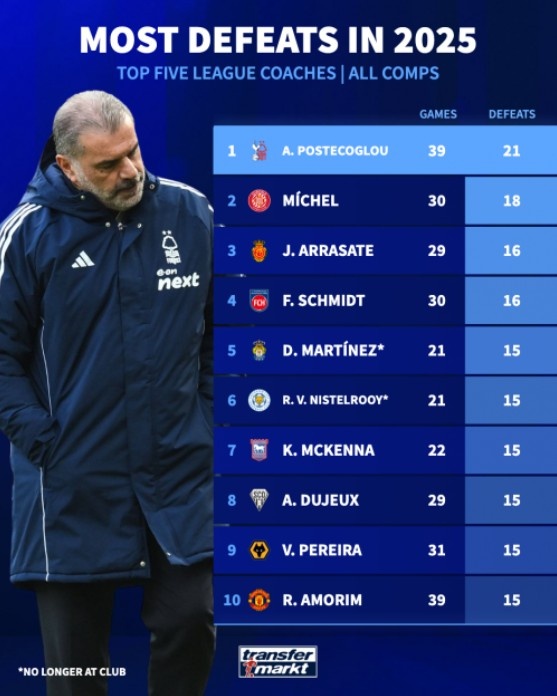 2025年五大联赛主教练输球场次排行:澳波21场居首,阿莫林15场