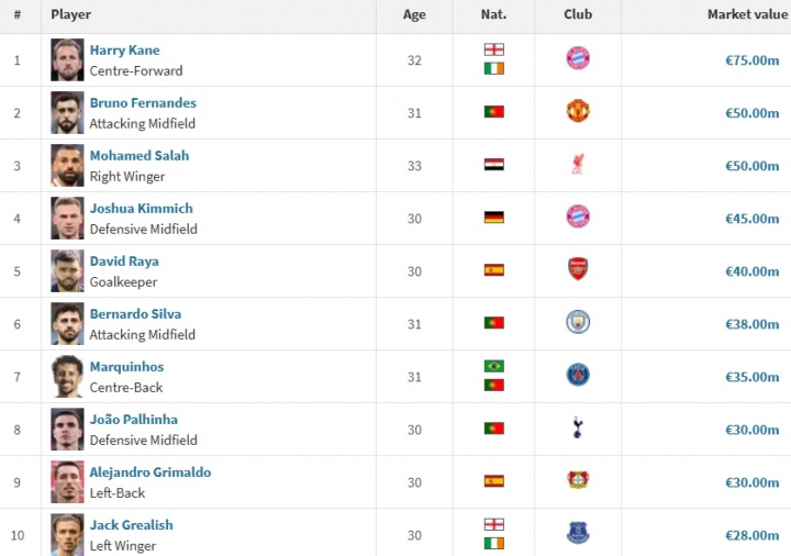 30岁以上球员身价榜:32岁凯恩7500万欧居首 B费萨拉赫5000万第二
