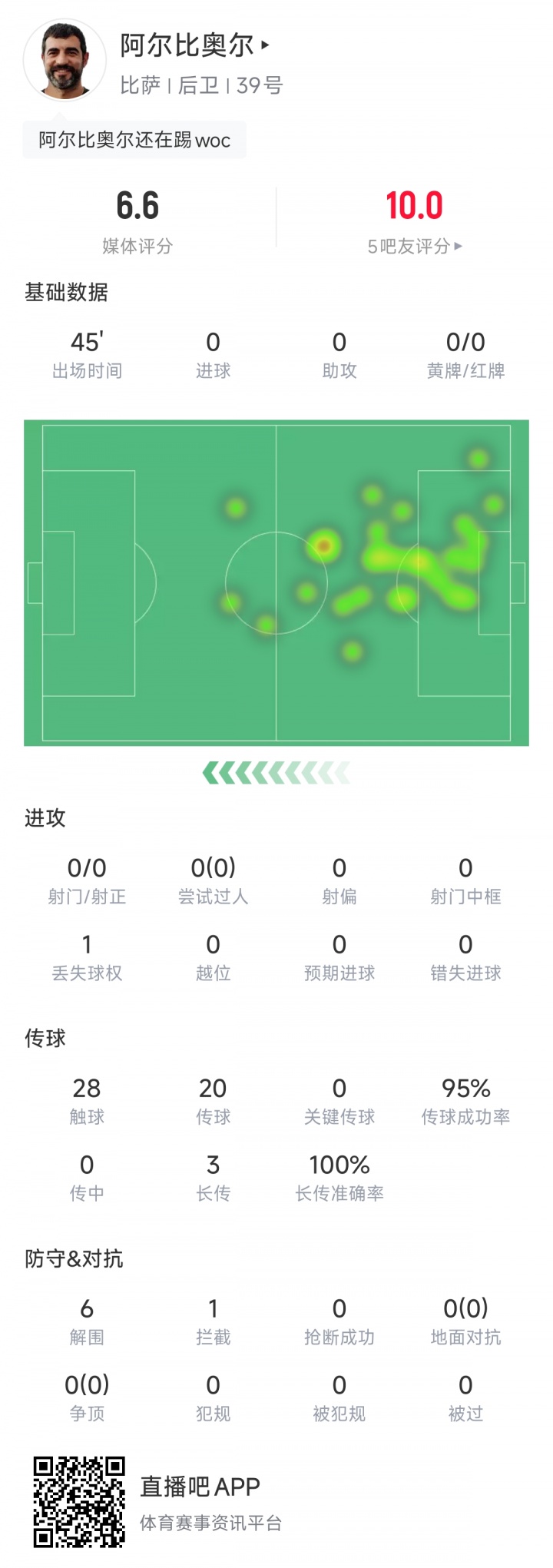 40岁的阿尔比奥尔本场没能打满全场,他在下半场被换下。这位曾经的西班牙国脚贡献6解围1拦截0被过的防守数据,28次触球仅有1次丢球权。