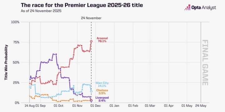 Opta英超夺冠概率:枪手76.14%领跑,曼城14.11%第二,红军跌第四