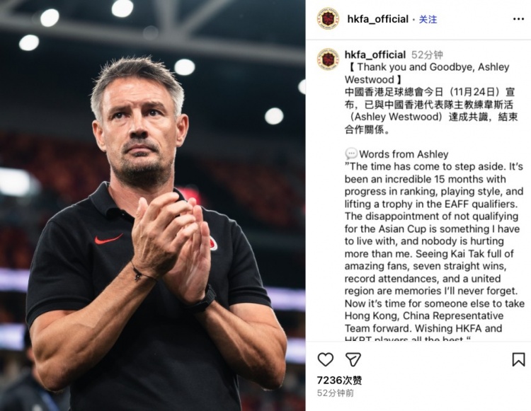 无缘亚洲杯,官方:中国香港队主教练阿什利·韦斯特伍德下课