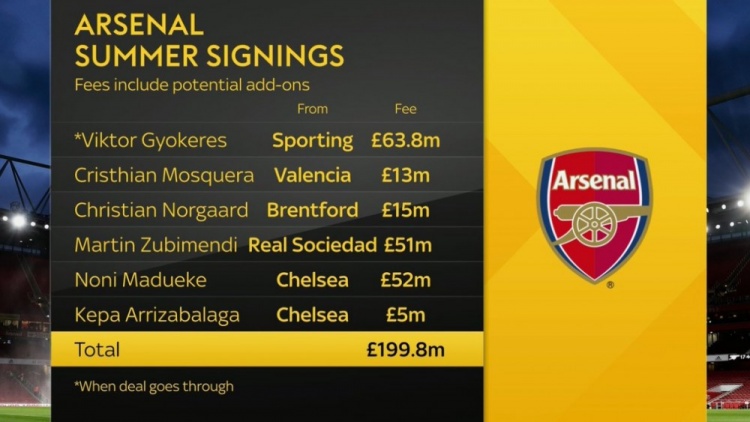 天空盘点阿森纳截止目前引援:引进六名球员一共花费近2亿镑