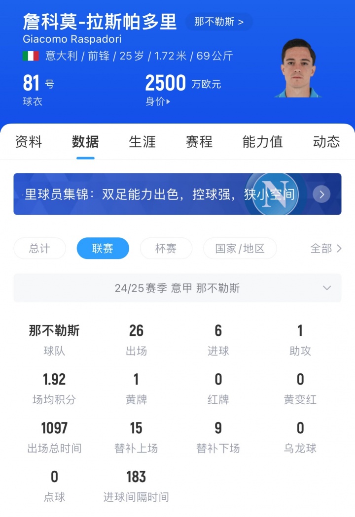 拉斯帕多里现年25岁,意大利时尚,那不勒斯在2023年破耗2800万欧元签下拉斯帕多里,上赛季球员为那不勒斯各赛事出场29次,孝敬6球2助攻,当今德回身价为2500万欧。