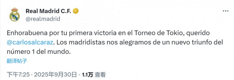 皇马官方社媒写说念:“亲爱的阿尔卡拉斯,祝福你初度取得ATP东京站冠军,皇马球迷为天下第一的又一次夺冠感到欢畅。”