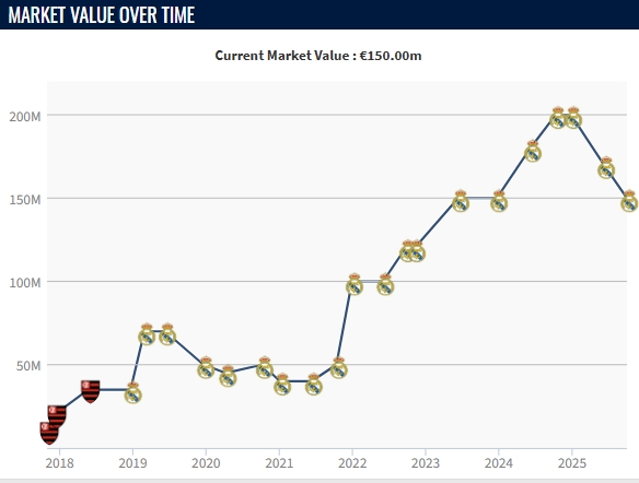 10月02日讯 当天德转更新了西甲球员身价,其中皇马边锋维尼修斯身价下落2000万欧,至1.5亿欧。