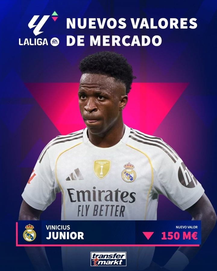 再度下落!德转当天更新西甲身价,维尼修斯下落2000万至1.5亿欧