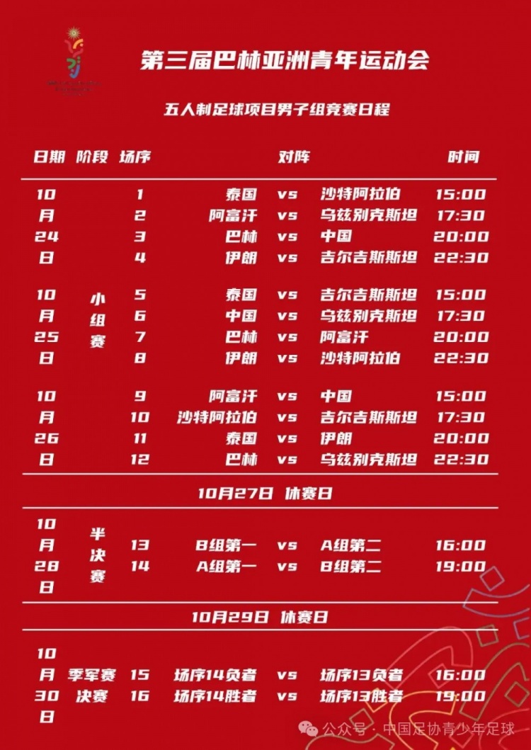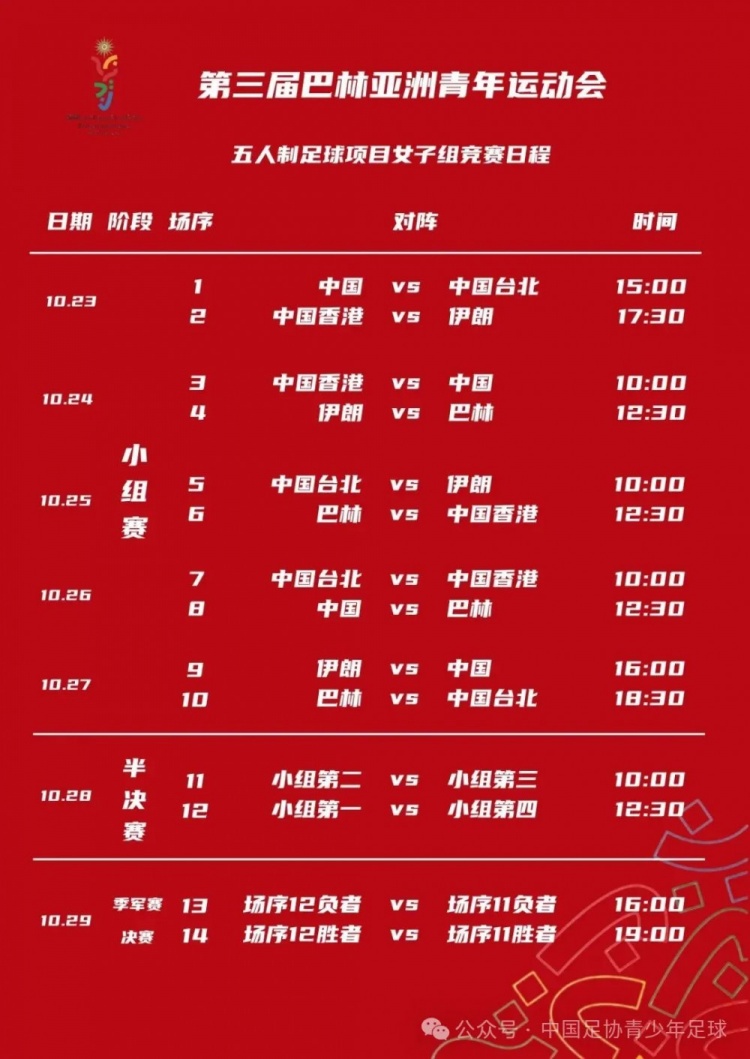 10月4日讯 10月22日-10月31日,第三届亚洲后生明白会(以下简称“巴林亚青会”)将在巴林举行,本届比赛初度将五人制足球纳入老成比赛风光,中国队辞别派出男、女队参赛。近日,巴林亚青会组委会公布五人制足球风光竞赛日程。