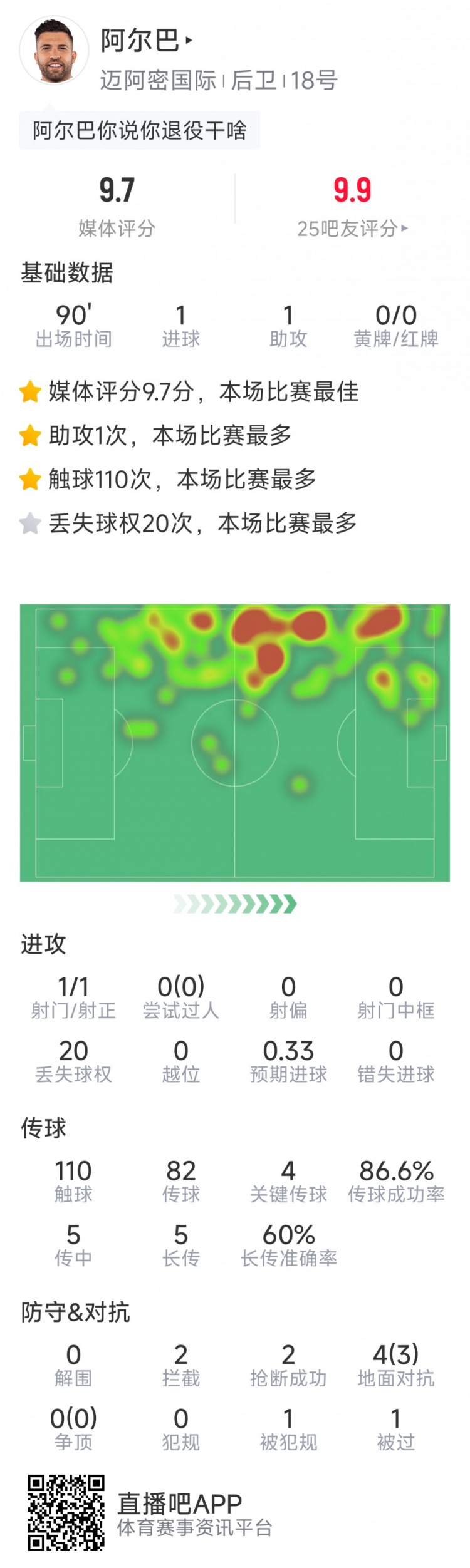 退役早了点?阿尔巴本场数据:传射立功,4次要津传球,评分9.7分