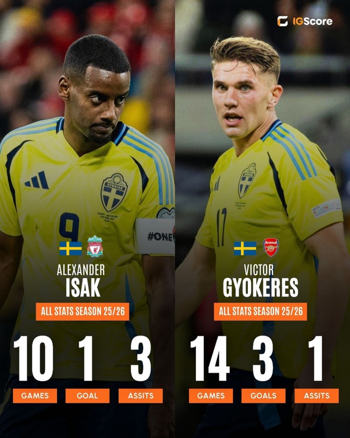 本赛季约克雷斯代表阿森纳和瑞典国度队出战14场比赛,孝顺3粒进球和1次助攻,当今他的德回身价为7500万欧元;伊萨克则代表利物浦和瑞典出战10场比赛,孝顺1粒进球和3次助攻,德回身价1.2亿欧元。