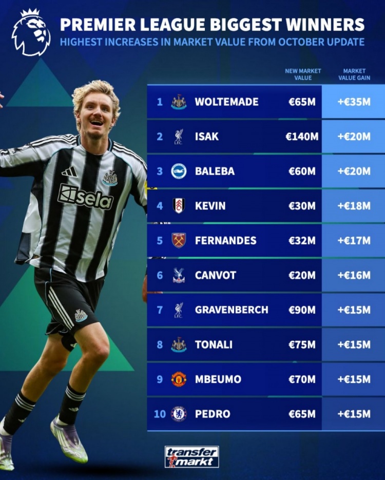 英超身价涨幅榜:沃尔特马德+3500万欧居首,伊萨克+2000万欧次席