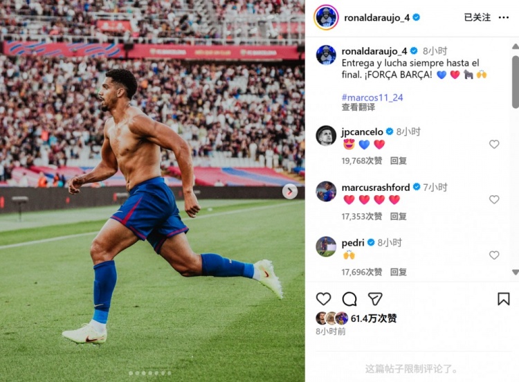 赛后阿劳霍也在社媒晒出进球后脱衣庆祝的像片,配文写说念:“遥远拼尽全力并坚握到临了一刻,加油巴萨!”