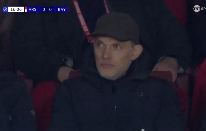 11月27日讯 阿森纳vs拜仁第17分钟,转播镜头给到看台,英格兰主帅图赫尔在现场。