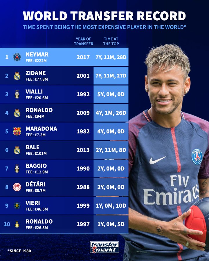 1. 内马尔 2.22亿欧元 2017年 7年11月又28天