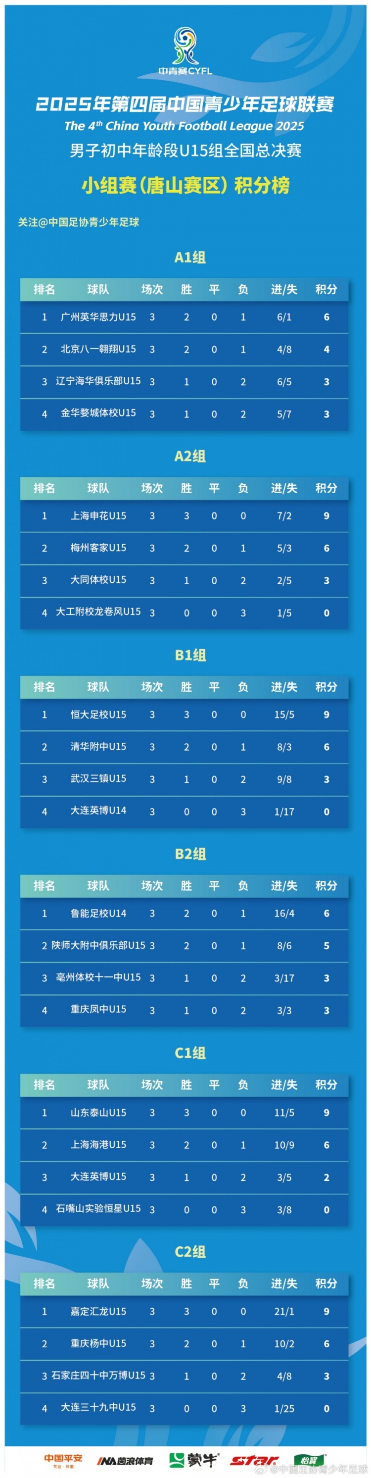 2025年第四届中青赛男人初中年事段U15组寰宇总决赛小组赛积分榜