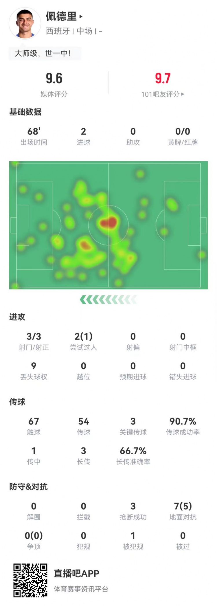 佩德里本场3射3正进2球+3重要传球,7反抗5告成+3抢断 获评9.6分