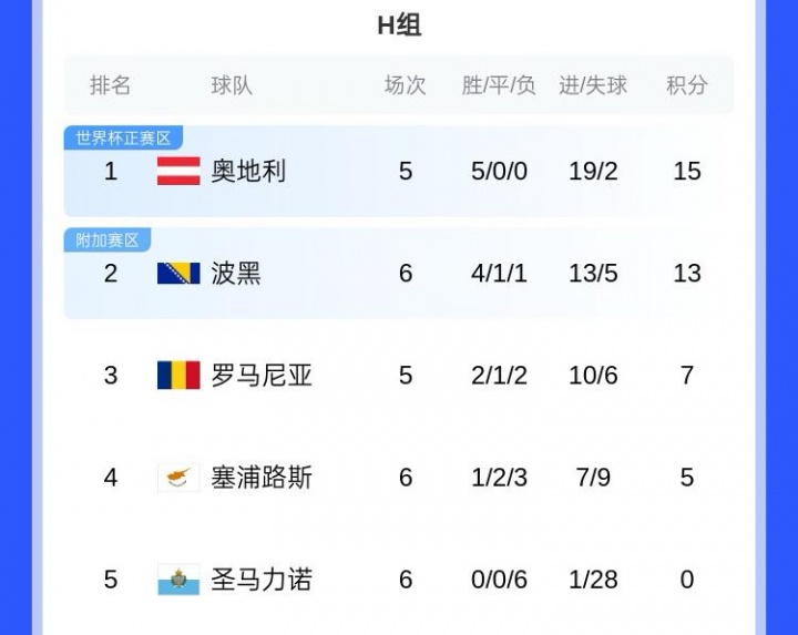 奥地利5连胜领跑H组,少赛一场越过波黑2分。圣马力诺6连败垫底,只进1球狂丢28球。