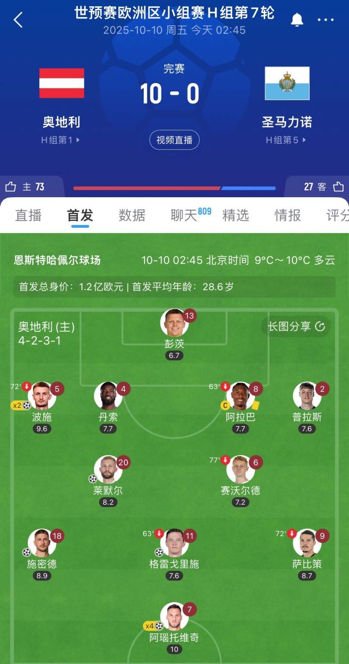 太狠了!世初赛奥地利10-0圣马力诺 首发11东说念主除门将外均参与进球