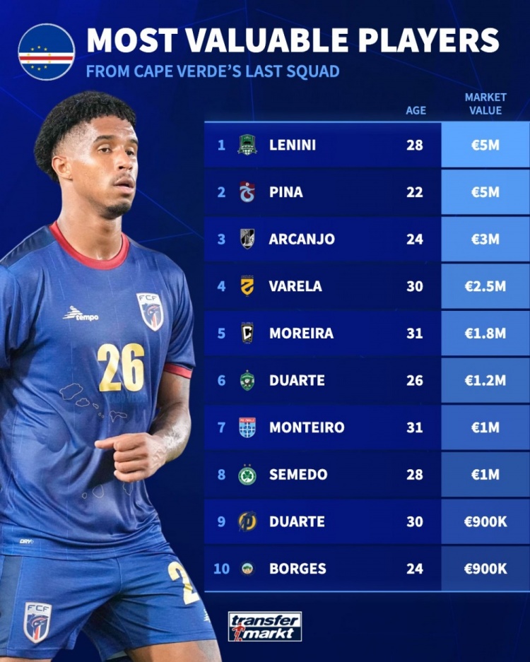 佛得角全队身价2720万欧,比国足(1263万欧)的两倍还多,但在非洲仅排在第19位。佛得角阵中身价最高的球员为着力俄超克拉斯诺达尔的凯文-皮纳和着力土超特拉布宗体育的瓦格纳-皮纳,两东说念主身价均为500万欧元,全队8名球员身价跨越100万欧。