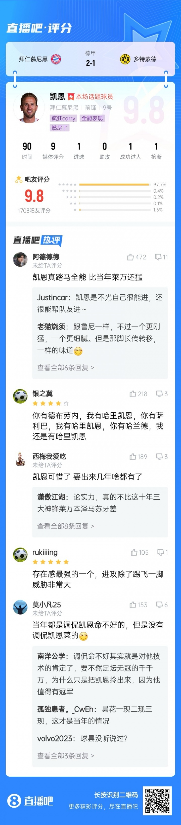 第七轮评比效果出炉,凯恩1进球+组织规画+环节守护,匡助拜仁2-1打败多特笑傲国度德比。最终凯恩获取吧友超7万票支撑,当选【X小红书德甲第7轮最好球员】!