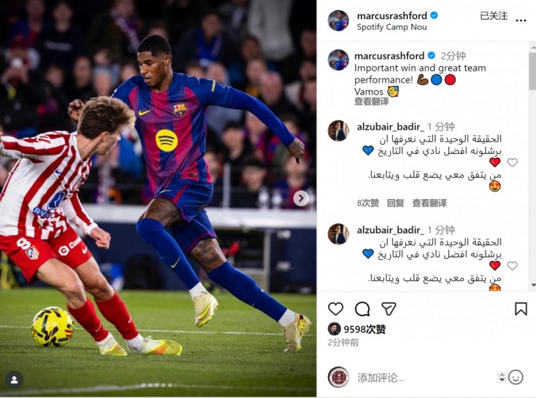拉什福德社媒晒出比赛像片,并写说念:“挫折的顺利,出色的团队线路。加油!”